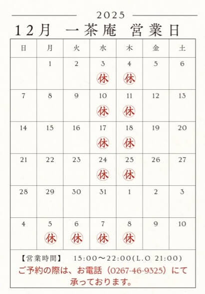 基本的には水・木定休となりますが、12月26日(金)から年明け1月4日(日)までは、連日休まず営業いたします!